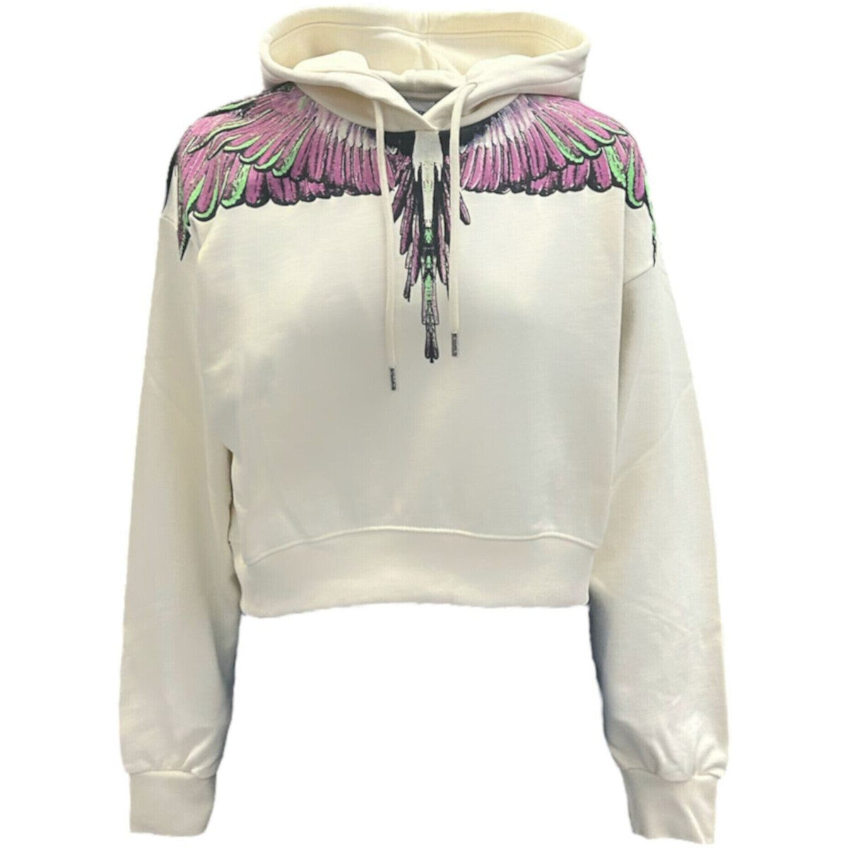 Felpa crop con cappuccio in cotone garzato color latte, stampa iconica blu, lilla e gialla sia sulla parte frontale che sul retro, firmata County of Milan